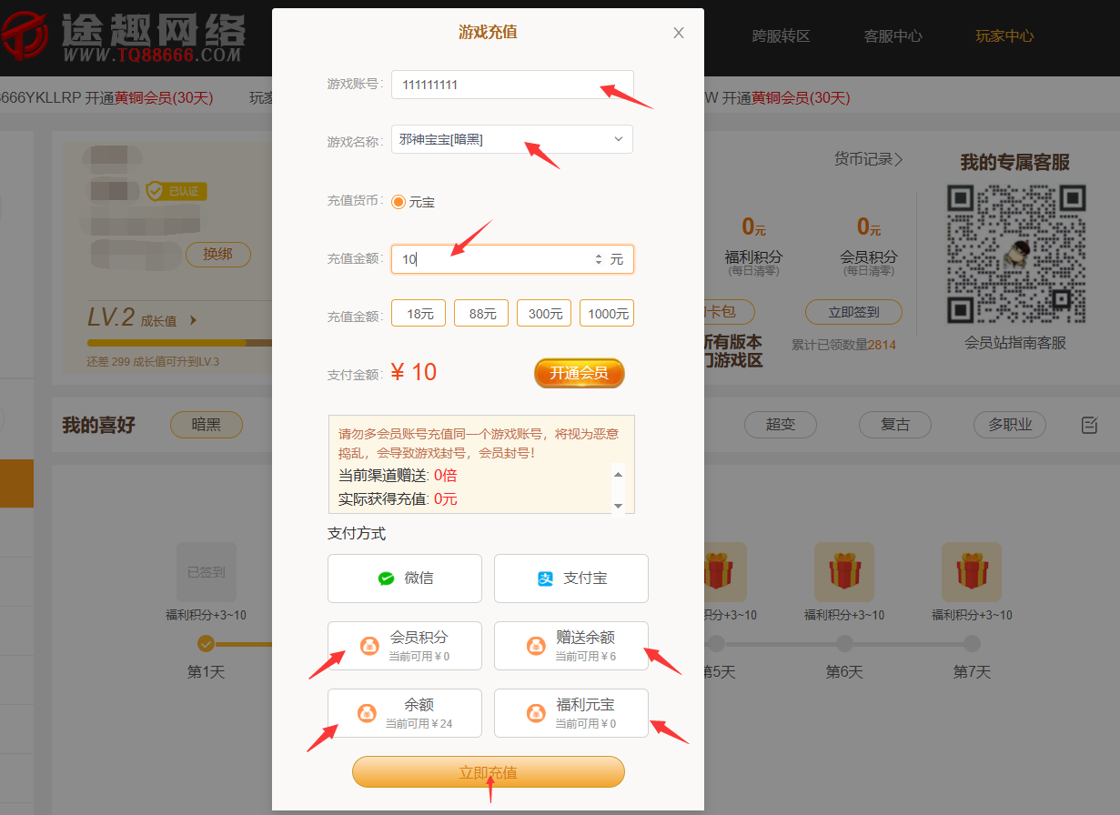 2,进入会员充值系统后,输入账号,选择对应游戏,输入充值金额即可